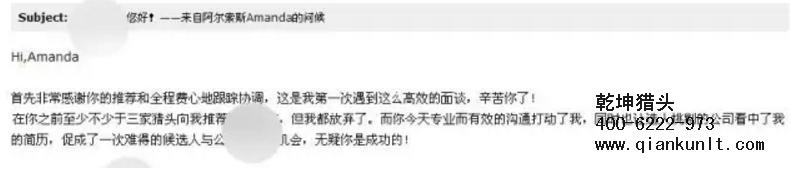所以能進入到面試環(huán)節(jié)實屬不易,而我的這個case呢,從和候選人溝通開始,到推薦,到安排面試也就是前后幾個小時的時間。當(dāng)時對這個候選人充滿了感激之情,不論如何,他愿意當(dāng)天下班就從萬象城這樣頂級的辦公區(qū)驅(qū)車兩小時去到偏郊,已實表誠意。更加難能可貴的是,當(dāng)晚他面試回到家后,盡管已是深夜,依然及時給我回了一封專業(yè)的反饋郵件。同時,被候選人信任的自豪感和責(zé)任感也油然而生有木有?